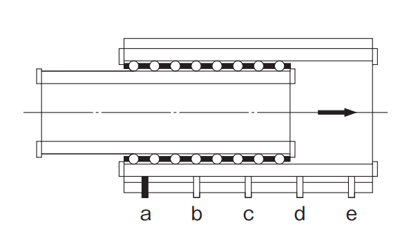 (7) 如图所示,将滚柱保持器放置在轨道的中央部分,用扭矩扳手均等地拧紧在有滚柱范围内的调整螺栓(b、c和d),直到千分表指到所定的变位量为止。然后全锁紧已调整部位的装配螺栓。